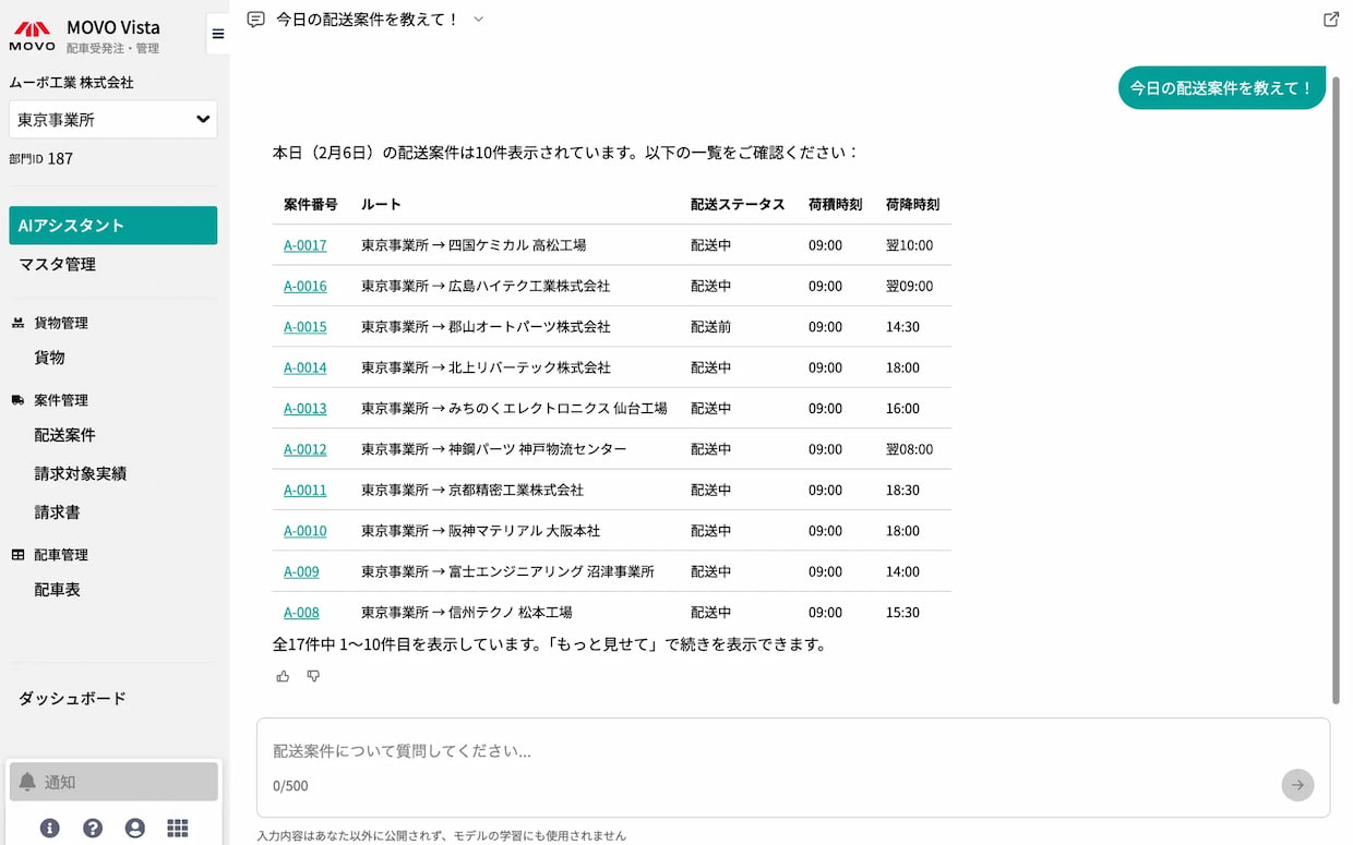 回答から案件詳細画面へ遷移し、依頼送信などの操作にもつなげられるほか、操作方法に関する質問にも対応する。利用はMOVO Vistaの既存ユーザー向けで無料(回数制限あり)。同社は「物流現場へのAI民主化」を掲げ、現場担当者の迅速な意思決定と業務効率化を支援していく。