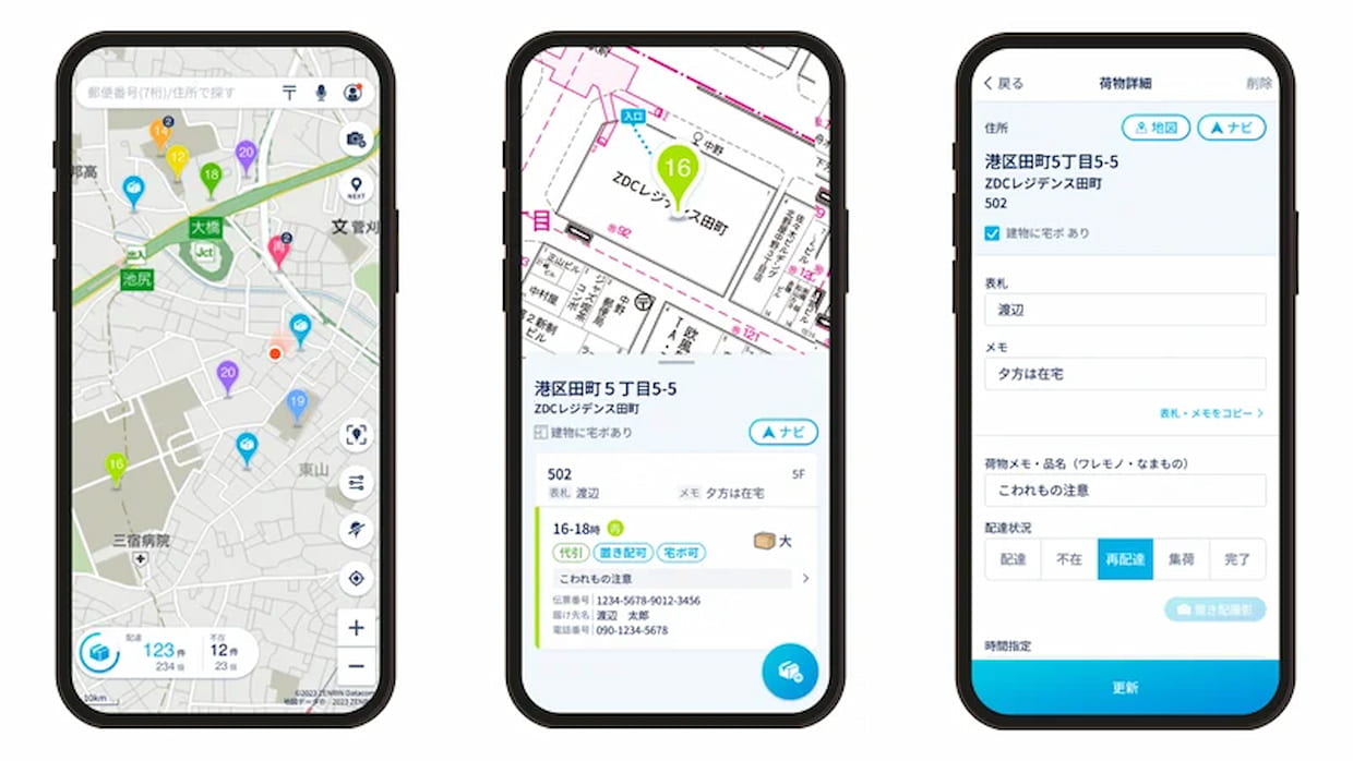 「GODOOR配達アプリ」はゼンリン住宅地図を活用し、建物名や表札、入口情報などを地図上で確認できる点が特長。荷物は住所や郵便番号の入力、伝票撮影で登録でき、配達完了や不在、再配達などのステータスを地図上で一元管理する。ナビゲーション機能と連携したルート案内にも対応する。