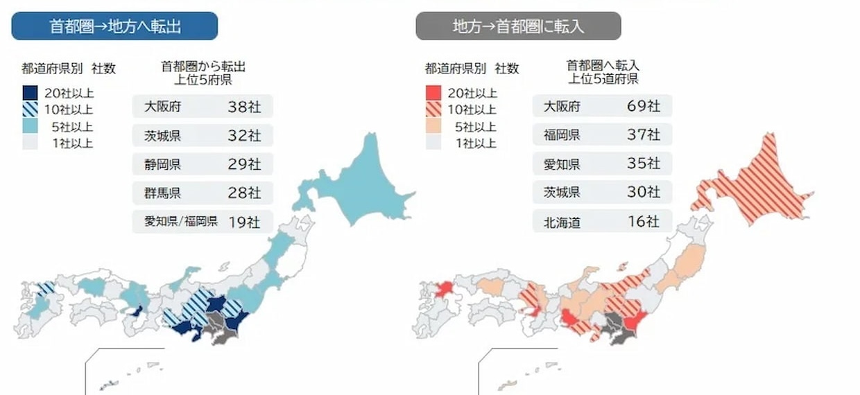 首都圏への転入は前年の296社から67社増え、22.6%増加した。一方、首都圏からの転出は前年の363社から38社減少した。転入元では大阪府が69社で最多、福岡県37社、愛知県35社、茨城県30社が続いた。