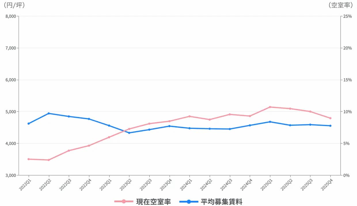 首都圏では25年第3四半期、第4四半期に空室率が低下し、募集賃料は横ばいで推移した。近畿では空室率が低下傾向にある一方、募集賃料は25年第2四半期以降に上昇基調となった。東海では第3、第4四半期に空室率が大きく低下し、第4四半期に募集賃料が上昇した。