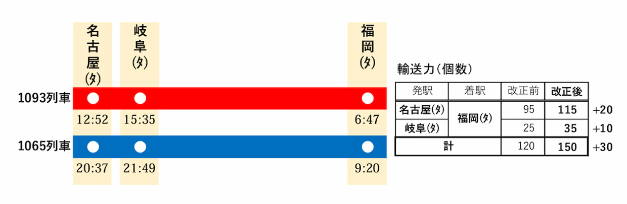 名古屋-福岡間も120個から150個へ30個増やす。名古屋115個、岐阜35個に振り分け、中部圏からの九州向け貨物を取り込む。自動車部品の生産拠点が集積する中部圏では、完成品や部品の九州方面への輸送でトラック手配が難航するケースが増えており、鉄道シフトへの関心が高まっていた。