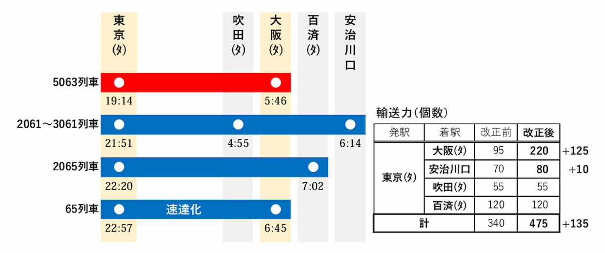 最大の目玉は東京-大阪間の増強だ。1日あたりの輸送力は340個から475個へ135個増える。新設の5063列車(東京19時14分発、大阪5時46分着)に加え、65列車は所要時間を18分短縮し、東京22時57分発、大阪6時45分着とする。関西圏での午前中配達に対応する体制を整えた。物流の大動脈である東京-大阪間で4割近い増枠を実現したことで、トラックから鉄道への切り替えを検討してきた荷主にとって、具体的な受け皿が広がった形だ。