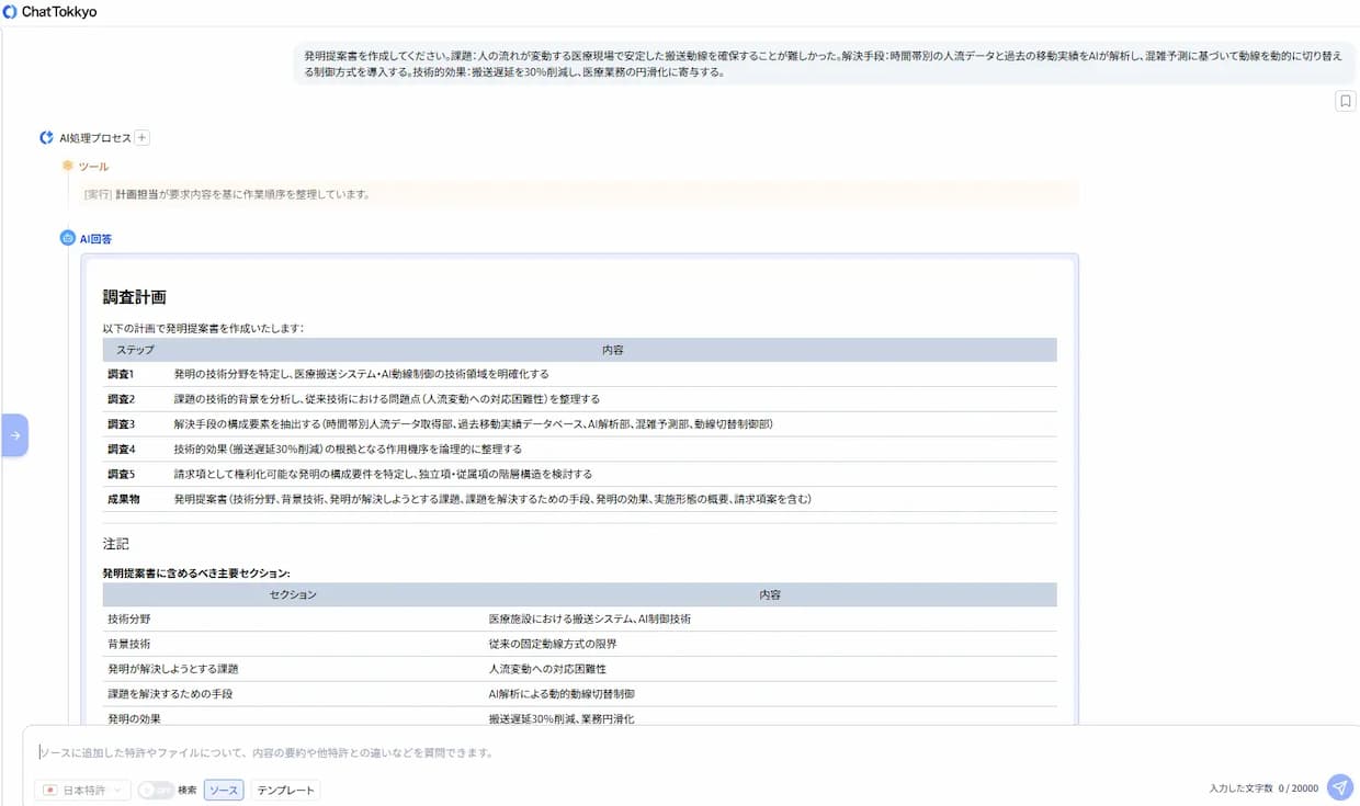 対象は、時間帯や混雑状況によって人流が変動する病院内で、搬送ロボットの移動効率が低下する課題に対応する制御技術。MyTokkyo.Aiは、入力された搬送フローや制御ロジックの資料を解析し、「課題」「解決手段」「技術的効果」の観点から発明要素を整理。医療施設向けロボットや動線制御に関する先行技術を参照しながら、発明提案書の作成までを支援した。