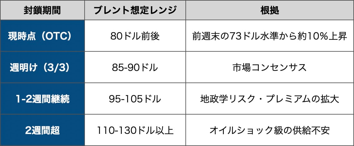 ブレント原油先物は週末の店頭取引で1バレル80ドル前後まで上昇した。前週末の73ドル前後から1割の急騰だ。封鎖が1-2週間続く場合、アナリストは95-105ドルへの上昇を見込む。2週間を超えれば110-130ドル以上と、1970年代のオイルショック級の水準に達するリスクがある。