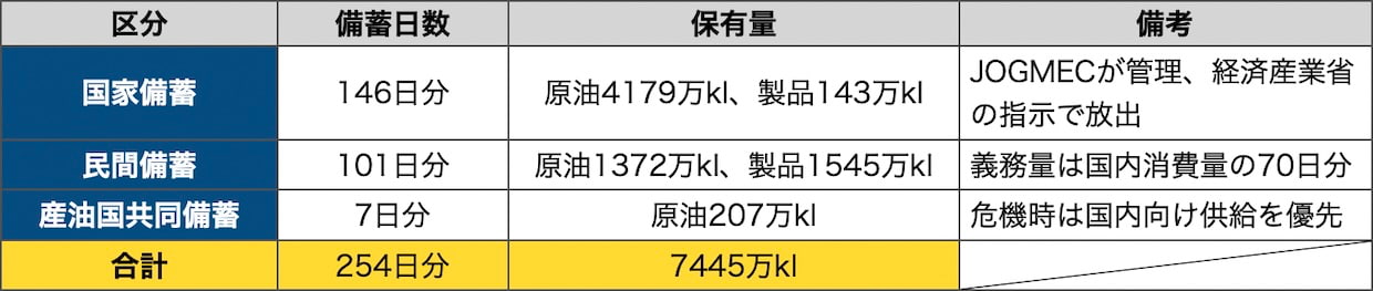 木原稔官房長官は「現時点で供給への即時影響の報告はない」との認識を示した。ただし、これは国内の石油備蓄が当面の需要を賄える前提に立ったものだ。資源エネルギー庁の公表データ(2025年12月末時点)によると、国家備蓄146日分、民間備蓄101日分、産油国共同備蓄7日分の合計254日分を確保している。数字の上では余裕があるように見えるが、民間備蓄の大半は精製・流通に組み込まれた在庫であり、全量を危機対応に回せるわけではない。封鎖が数週間に及べば、備蓄放出だけで需要を賄い続けることは難しくなる。