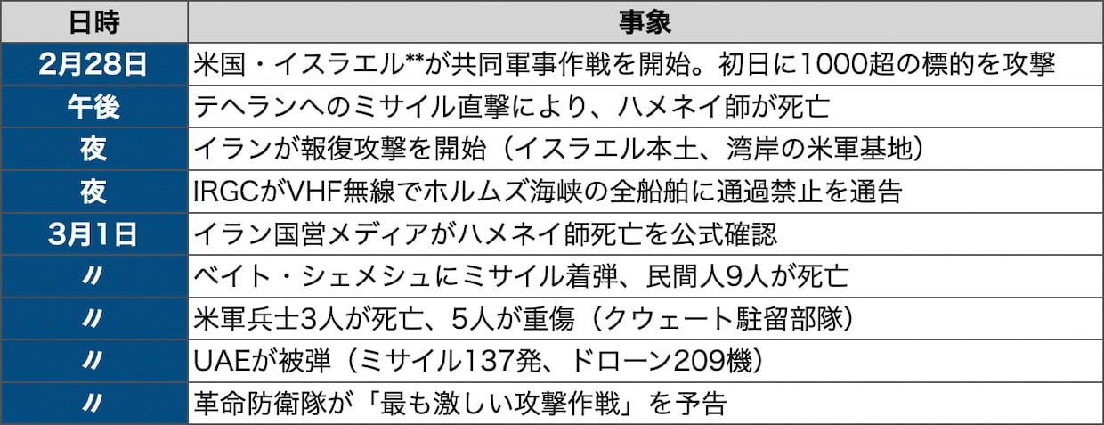 2月28日、米国とイスラエルはイランに対する共同軍事作戦を開始した。米側は「オペレーション・エピック・フューリー」、イスラエル側は「ローリング・ライオン」の作戦名で、核施設、弾道ミサイル基地、革命防衛隊の指揮所、海軍艦艇、防空システムなどを標的とした。米中央軍(CENTCOM)の発表では、初日だけで1000を超える標的を攻撃した。