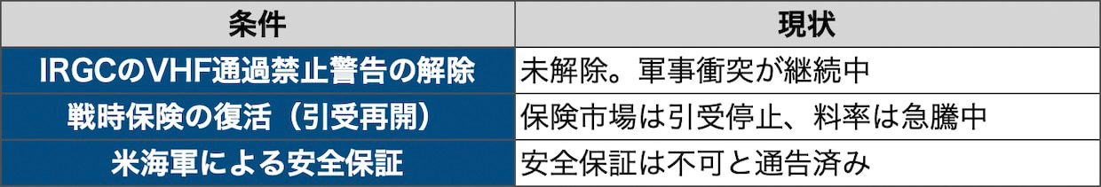 ホルムズ海峡の商業航行が再開するには、革命防衛隊のVHF通過禁止警告の解除、戦時保険の復活、米海軍による安全保証の3条件が必要とされる。いずれも軍事衝突が続く限り実現は難しい。
