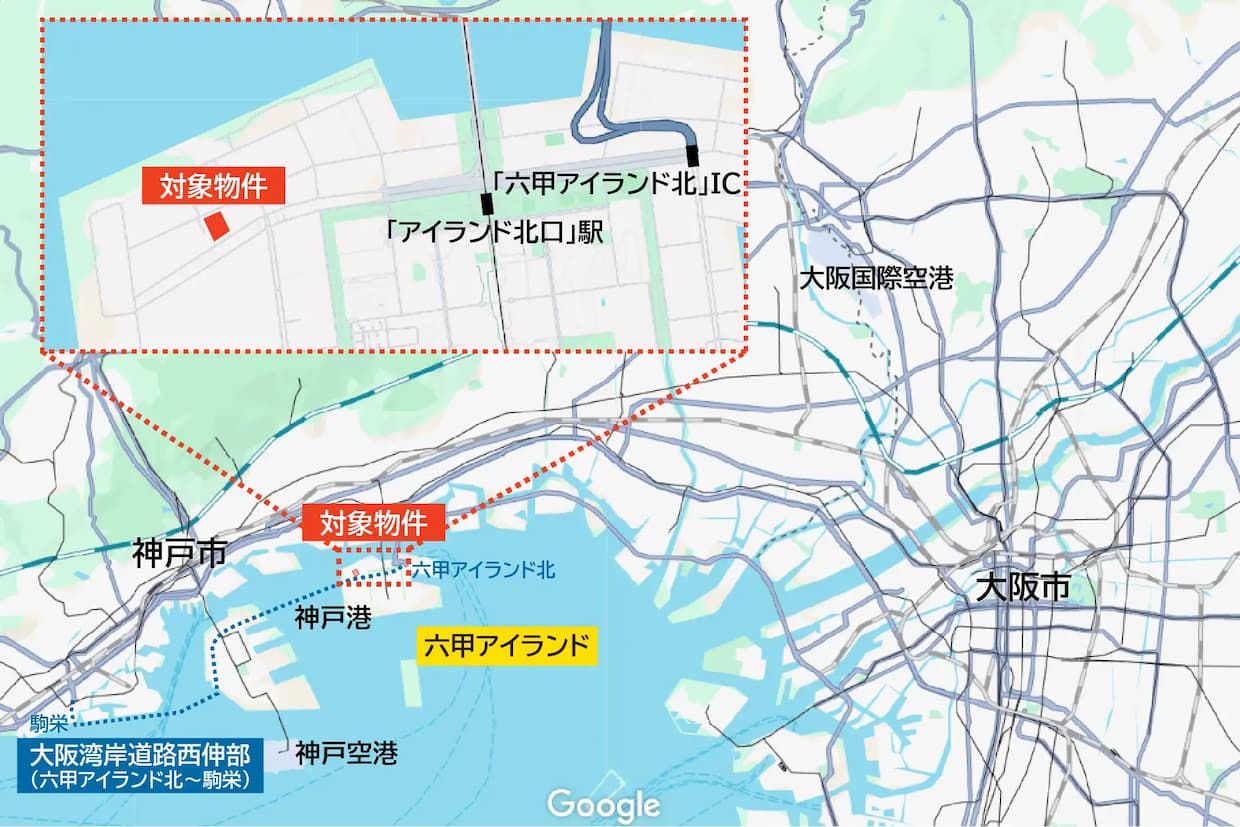 立地は神戸港の湾岸エリアに位置する六甲アイランドで、コンテナターミナルを擁し、関西主要都市へのアクセスに優れる。阪神高速5号湾岸線・六甲アイランド北インターチェンジから2キロと、海運・陸運の結節点としての利便性が高い。大阪湾岸道路西伸部の整備も進んでおり、中長期的な交通利便性の向上も見込まれる。六甲ライナー・アイランド北口駅から1.5キロと、公共交通による通勤にも対応する。