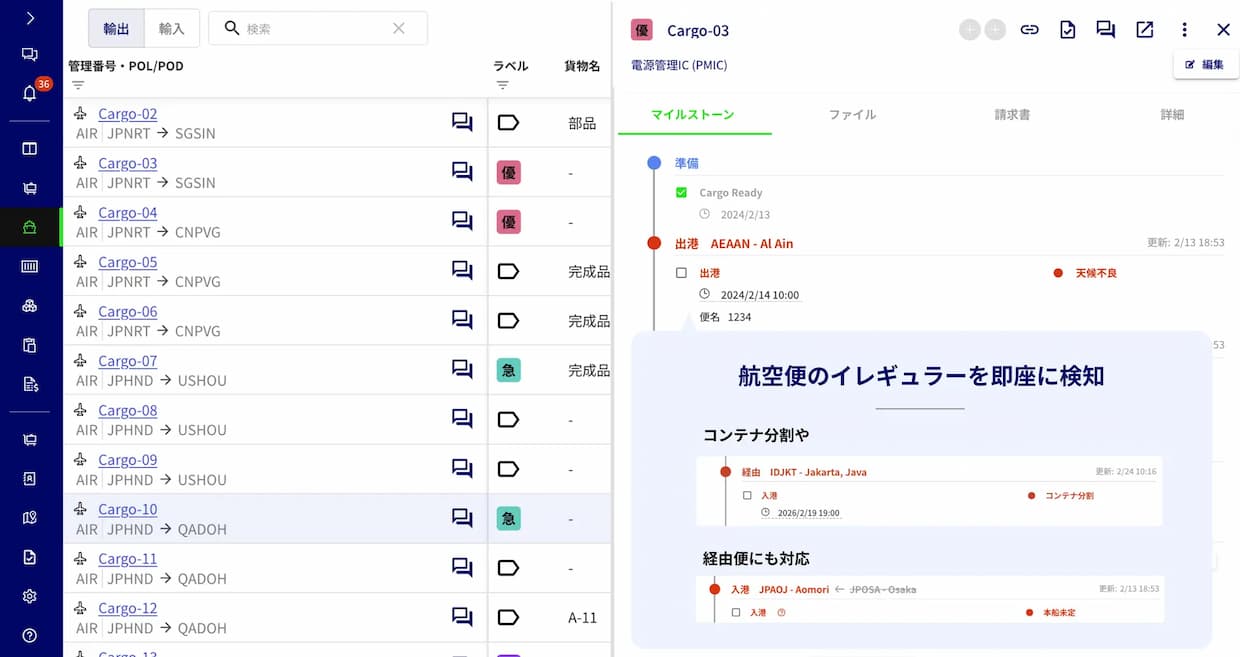 サービス・商品Shippio(シッピオ、東京都港区)は2日、提供する貿易管理プラットフォームにで、航空貨物の動静を自動で追跡する「航空貨物自動トラッキング機能」の提供を開始したと発表した。遅延や欠航の有無を含む輸送状況をクラウド上で可視化し、関係者間でリアルタイムに共有できる。同社は2024年11月に航空貨物運送の免許を取得しており、今回の機能追加により、海上輸送に加えて航空輸送も管理対象に取り込んだ。