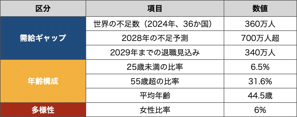 ドライバー不足の規模は地域によって大きく異なるが、「高齢化」と「若年層が入ってこない」という構造要因は世界共通だ。IRUの調査では、25歳未満のトラック運転手は全体の6.5%にとどまり、23年から24年にかけてさらに5.8%低下した。55歳超は31.6%を占め、こちらは1.6%上昇している。今後5年間で340万人が退職する見込みだ。