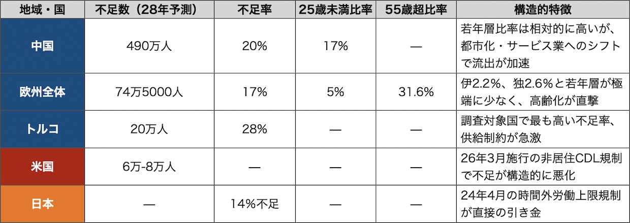 国際世界のトラック運転手不足が構造的に深刻化している。国際道路輸送連合(IRU)が2025年3月に公表した最新レポートによると、調査対象36か国で360万人分のポストが埋まっていない。28年までに700万人超に倍増するとの予測もある。日本の24年問題は世界的なドライバー不足の一断面にすぎず、各国が異なる規制環境のもとで同じ構造問題に直面している。(編集長・赤澤裕介)
