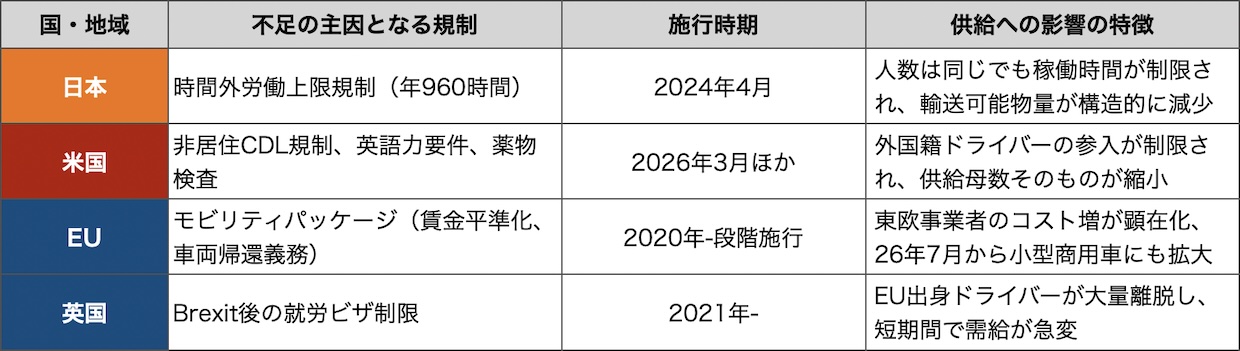 各国が直面する「規制強化×ドライバー不足」の構図は共通しているが、規制の中身と影響のかたちは異なる。