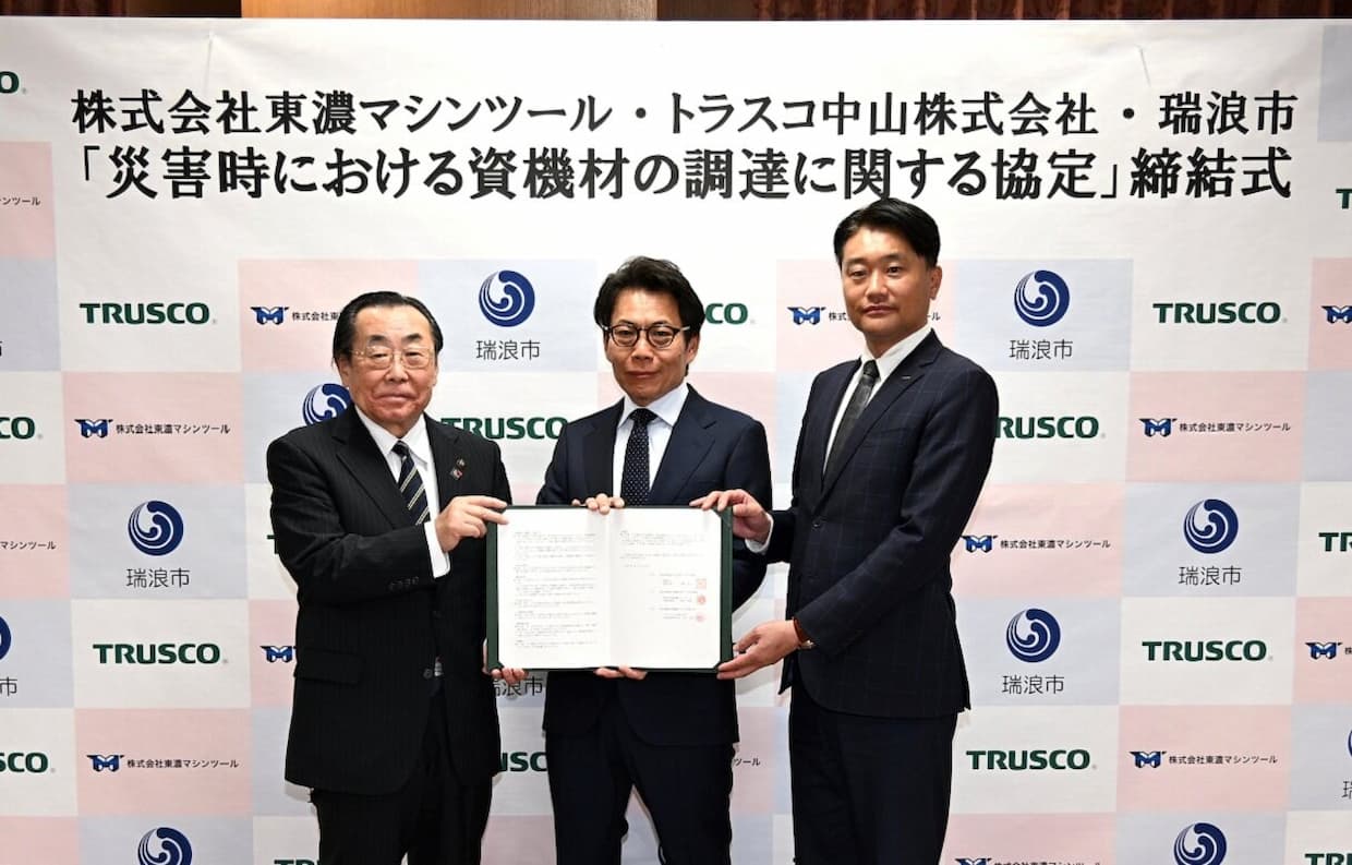 協定は、瑞浪市内で大規模災害が発生した場合に、市の要請に基づきトラスコ中山が保有する災害支援物資や各種資機材を提供するもの。2026年5月に稼働予定の物流センター「プラネット愛知」(愛知県北名古屋市)や「プラネット東海」(愛知県岡崎市)をはじめ、全国28か所の物流センターの在庫と物流ネットワークを活用し、被災地へ迅速に供給する体制を構築する。