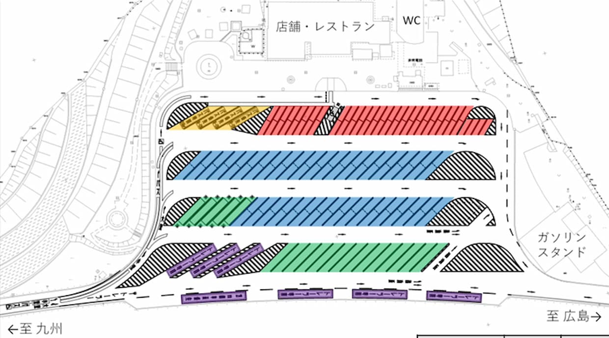 国内西日本高速道路(NEXCO西日本)は3日、山陽自動車道下松サービスエリア(SA)上り線(広島方面)で実施していた大型車駐車マス拡充工事が2月26日に完了したと発表した。