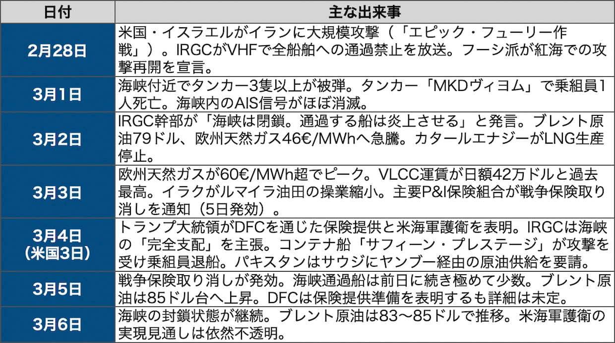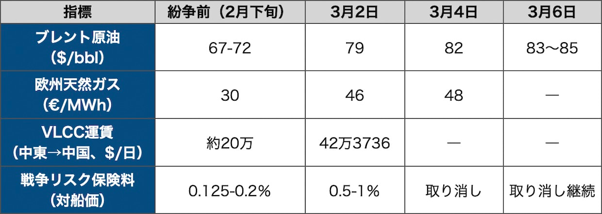 国際米国・イスラエルによるイラン攻撃から1週間が経過した。ペルシャ湾と外洋を結ぶホルムズ海峡はタンカー交通量が9割減の状態が続き、原油価格は85ドル前後まで上昇している。コンテナ船への攻撃や戦争保険の取り消しで商業船舶が通過できない状態が固定化しつつあり、アジア各国のエネルギー調達に深刻な影響が及んでいる。本稿では3月6日時点の状況を、エネルギー価格、海上輸送、アジアへの波及、米国の対応策の4つの軸で整理する。(編集長・赤澤裕介)