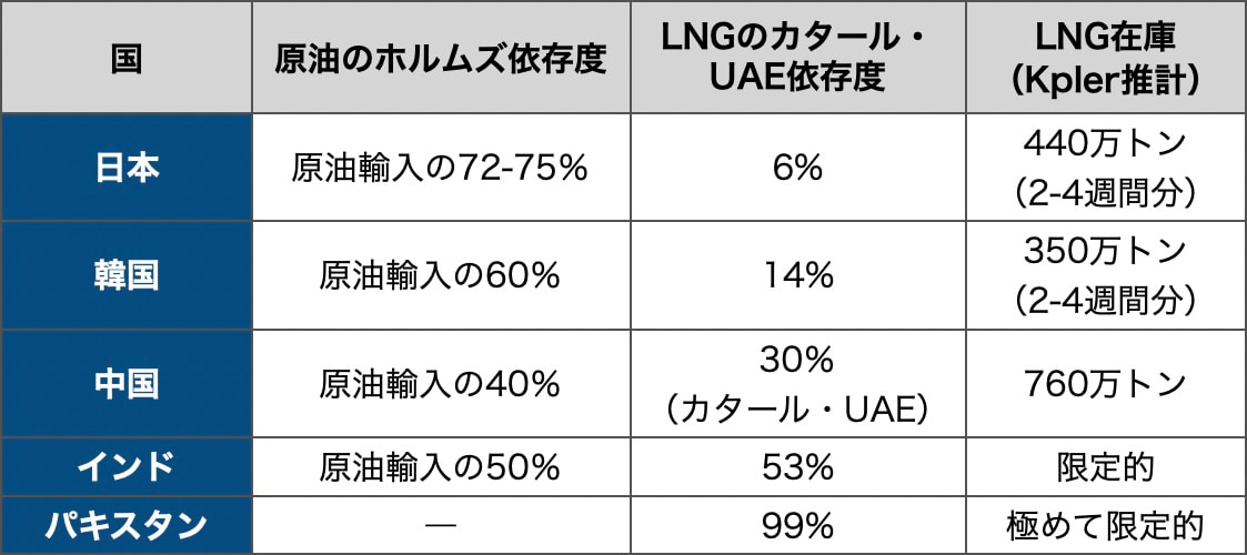 パキスタンはLNG輸入の99%をカタール・UAEに依存しており、最も深刻な影響を受けている。同国エネルギー省は3月4日、サウジアラビアに対し紅海側のヤンブー港経由での原油供給を要請し、サウジ側が応じる方針を示した。中国はLNG在庫が760万トンと比較的厚いが、封鎖が続けば大西洋産カーゴの調達を迫られ、太平洋市場全体の需給がタイトになる。