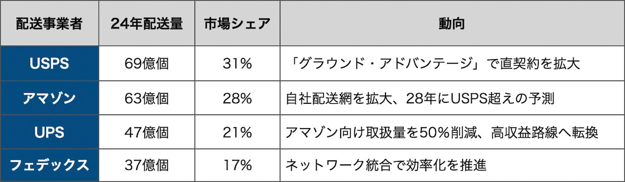 米国の小包配送市場はこれまで、USPS(米国郵便公社)、UPS、フェデックスの「ビッグ3」が支配してきた。ここに割って入ったのがアマゾン・ロジスティクスだ。ピツニーボウズが毎年発行する小包配送指数によると、アマゾン・ロジスティクスの2024年の米国内配送量は63億個で、前年比7.3%増。市場シェアは28%に達し、首位USPSの69億個(シェア31%)に肉薄している。このペースが続けば、28年にはアマゾンがUSPSを抜いて米国最大の小包配送事業者になるとの予測もある。