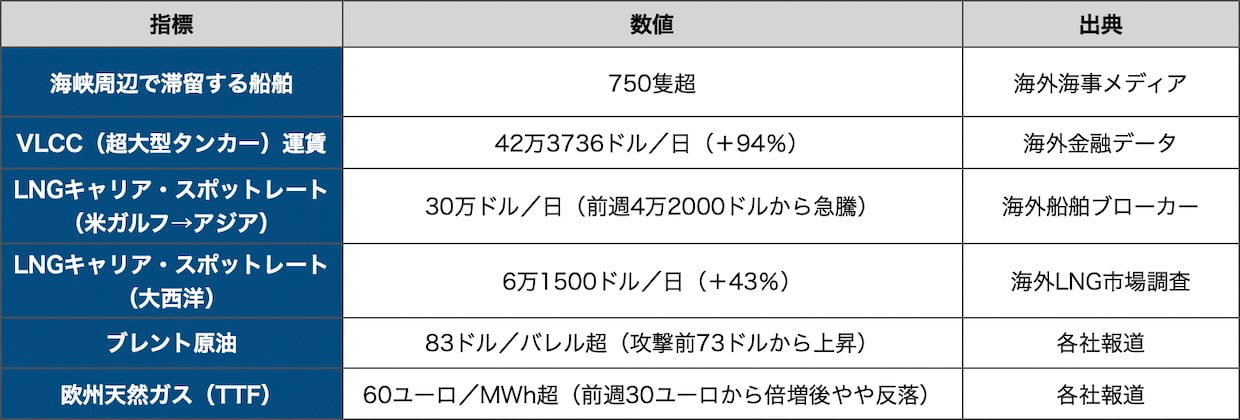 LNG(液化天然ガス)キャリアのスポットレート急騰は、海外船舶ブローカーの週報によると米ガルフ→アジアで1日あたり30万ドルに達した。2月25日時点の4万2000ドルからの上昇幅はおよそ650%に上る。カタールがLNG生産を停止しフォースマジュールを宣言したことで、アジアの買い手は米国や豪州からの調達に切り替えを迫られ、航海距離の延長が船腹需要をさらに押し上げている。