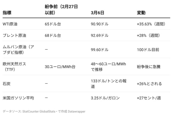 国際米国・イスラエルの対イラン軍事作戦(2月28日開始)から7日目の3月6日、ホルムズ海峡の商業船舶はほぼ完全に止まったままだ。原油価格はWTI(ウエスト・テキサス・インターミディエイト)が90.90ドル/バレル、ブレントが92.69ドル/バレルで週を終え、WTIは1983年の先物取引開始以来、最大の週間上昇率(+35.63%)を記録した。同日、トランプ大統領がイランに「無条件降伏」を要求し、紛争長期化の懸念が一気に強まっている。(編集長・赤澤裕介)
