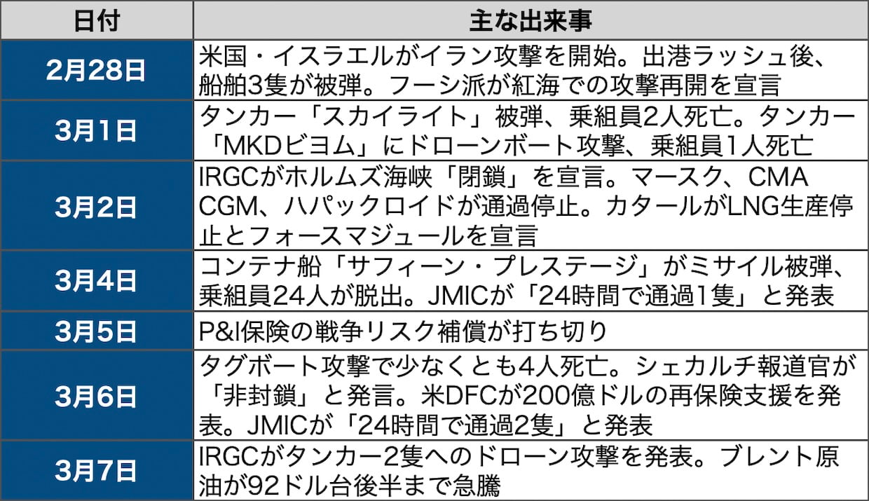 ところがIRGCは3月2日に海峡の「閉鎖」を宣言済みで、実際に2月28日以降少なくとも8隻を攻撃している。3月6日にはコンテナ船サフィーン・プレステージの救援に向かったタグボートがミサイルで攻撃され、国際海事機関(IMO)によると少なくとも4人が死亡、3人が重傷。7日にはタンカー2隻(プリマ、ルイーズP)へのドローン攻撃をIRGCが発表した。救援船すら標的になる状況だ。