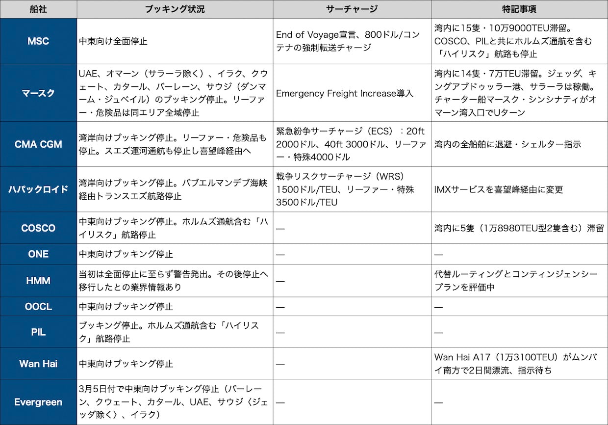 国際ホルムズ海峡が事実上の封鎖状態に入り、主要コンテナ船社の対応が出そろった。ブッキング停止の範囲、緊急サーチャージの水準、代替港の選択は船社ごとに大きく異なる。荷主・フォワーダーが実務判断に使えるよう、3月8日時点の各社対応を一覧で整理した。(編集長・赤澤裕介)