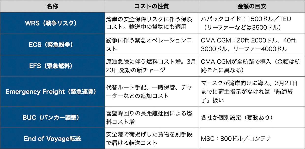 船社が導入済み、または導入を発表した海上サーチャージをまとめた。