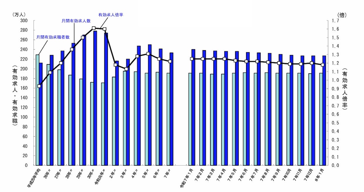 もっとも、求人の強さがそのまま採用充足につながっているわけではない。全体の月間有効求人数は229万4228人で5.4%減となる一方、有効求職者数は180万9573人で0.2%減にとどまった。季節調整値では有効求人数が前月比0.1%減、有効求職者が同0.9%増となっており、需給は求人側の優位を保ちながらも、企業の採用姿勢には慎重さがにじむ。
