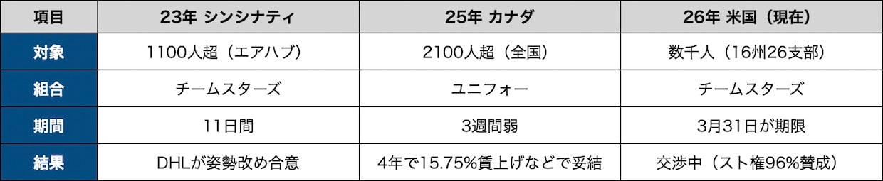国際DHLエクスプレスの米国で、労働組合チームスターズが96%の賛成でスト権を確立した。3月31日の労働協約期限までに合意に至らなければ、数千人のドライバーと倉庫作業員が職場を離れる。交渉はフィラデルフィアで続いているが、組合側は「1日たりとも延長しない」と明言しており、期限の重みは増している。(編集長・赤澤裕介)