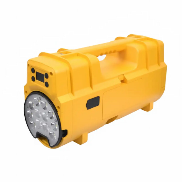 本体重量は7.5キロで、作業員一人での持ち運びが可能。伸縮式アームにより最大1.8メートルの高さまで照明を上げられる。底面には強力磁石を4つ備え、ダンプトラックや平ボディトラック、建設機械などの車両に直接固定して使用することもできる。連続使用時間はMIDモード(5000ルーメン)で17時間、家庭用コンセントで6時間充電できる。照明部の反対側には点滅式の赤色ビーコンも搭載する。