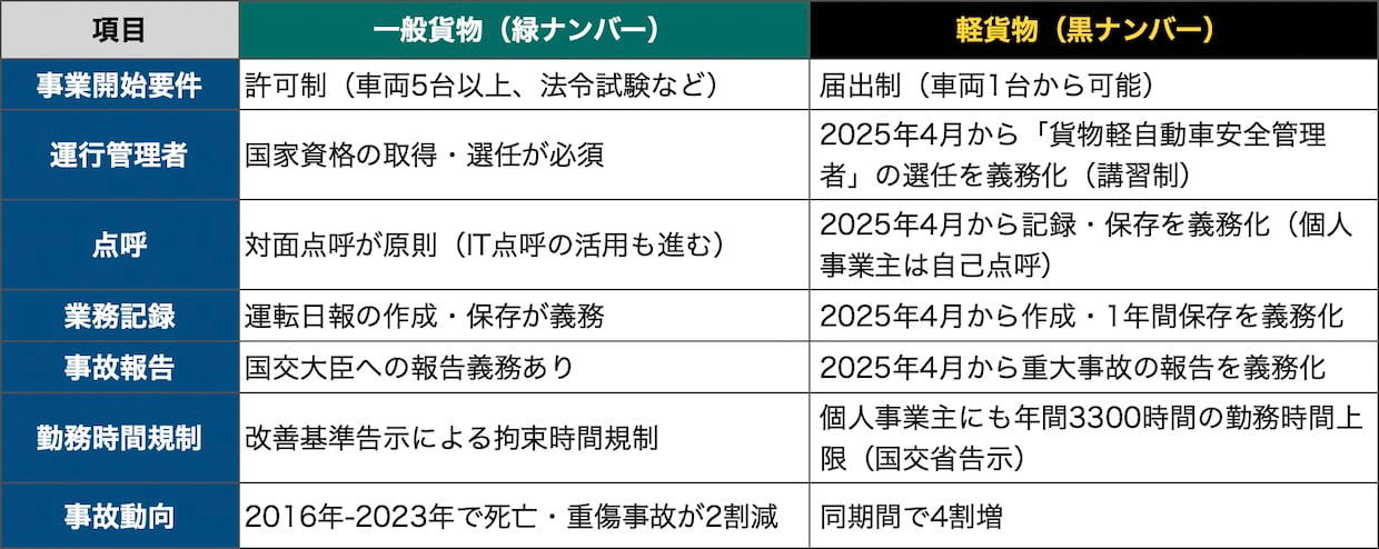 軽貨物の安全規制と一般貨物の主な違いを整理すると、以下のようになる。
