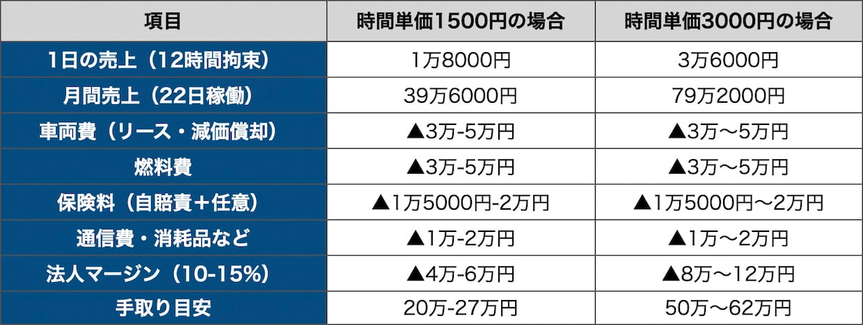 時間単価1500円と3000円で、ドライバーの手取りがどう変わるかを試算すると次のようになる。