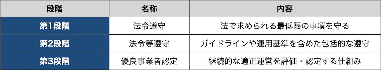 第1段階は「法令遵守」。最低限、法で求められる事項を守ること。