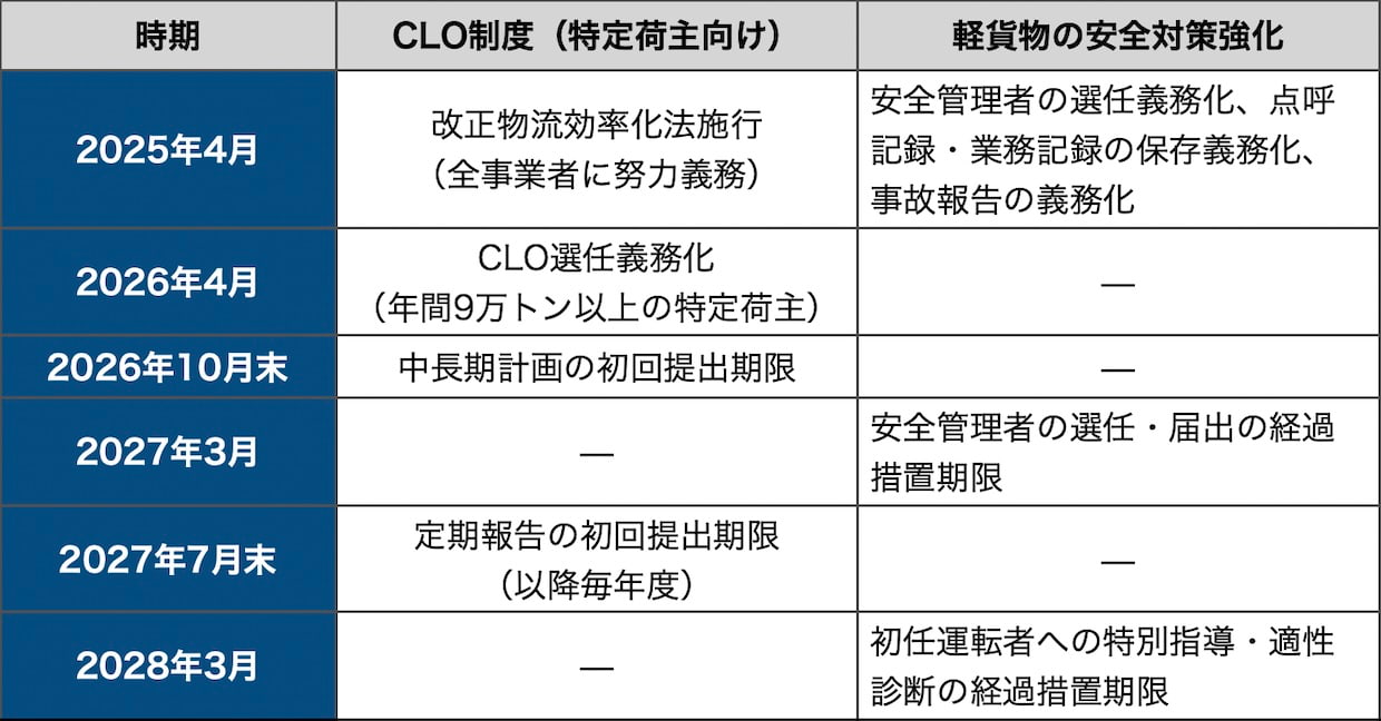 CLO制度と軽貨物安全規制の主なスケジュールを整理すると、以下のようになる。