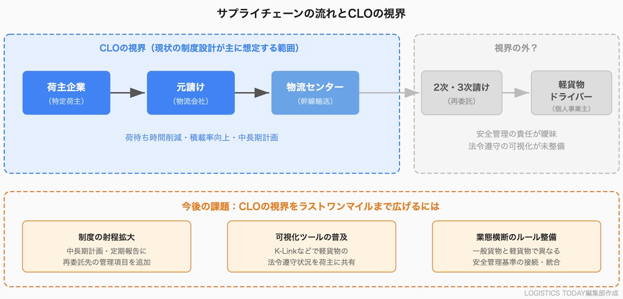 現状、多くの荷主企業は軽貨物の再委託構造を詳しく把握していないのではないか。元請けの物流会社に委託した荷物が、2次請け、3次請けを経て、最終的に個人事業主の軽貨物ドライバーが届けている。その過程で、安全管理の責任がどこにあるのかは曖昧になりやすい。CLOの役割が「サプライチェーン全体の効率化と適正化」であるなら、ここはいずれ向き合わなければならない領域だろう。