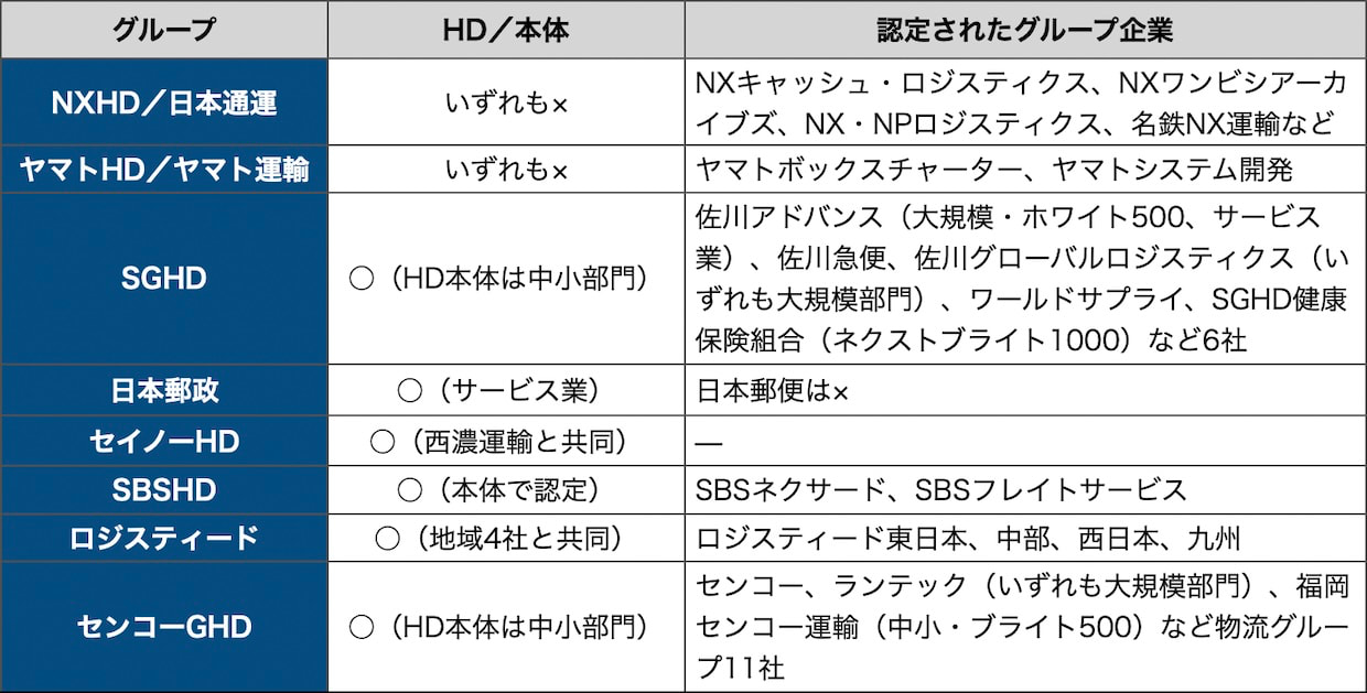 一方で、NXHDも日本通運も認定法人一覧に名前がない。認定されているのは子会社のみだ。ヤマトHD、ヤマト運輸本体も同様で、認定はヤマトボックスチャーターとヤマトシステム開発の2社にとどまる。日本郵政はサービス業として認定を受けたが、日本郵便の名前はない。