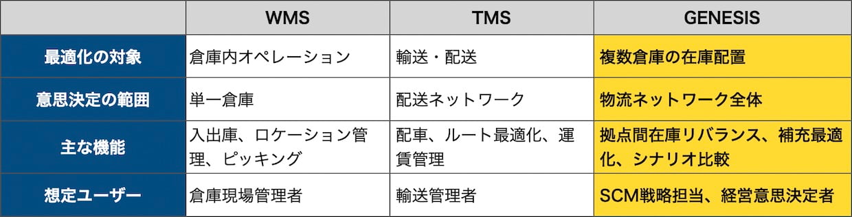 複数倉庫の在庫配置は従来、需要予測と担当者の経験に依存してきた。しかしEC(電子商取引)の拡大でSKU数と需要変動が急増し、在庫配置は人間の経験だけでは扱いきれない計算問題になりつつある。WMS(倉庫管理システム)は個々の倉庫内のオペレーションを、TMS(輸配送管理システム)は配送を最適化するが、「どの倉庫にどれだけ在庫を置くか」というネットワーク全体の意思決定を担うツールは、多くの企業でまだ整っていない。在庫配置は倉庫運営の問題ではなく、企業全体のサプライチェーン戦略の問題になりつつある。日本企業ではこの意思決定が事業部単位で分断されているケースも多く、ネットワーク全体を横断的に最適化する仕組みの整備は遅れている。GENESISはこの空白を埋める研究として開発された。