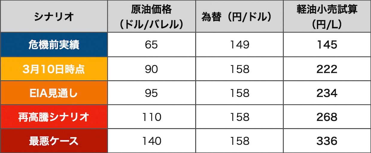 軽油価格への影響も整理する。10日時点のブレント90ドル、WTI81ドルは前日の119ドルから大幅に下がったが、危機前(65ドル)の水準には程遠い。為替も10日時点で157円台と円安が続いている。本誌試算モデルでは、ブレント90ドル・為替158円で軽油小売222円となる。既報の「200円超」水準は、原油の急落後もむしろ深まった形だ。EIAが見通す95ドル超が2か月続くシナリオでは234円が常態化する計算になる。