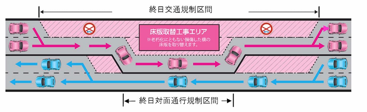 対面通行規制区間では車線幅が通常の3.5メートルから3.25メートルに縮小する。特殊車両については事前のルート検討や通行許可申請を求めている。