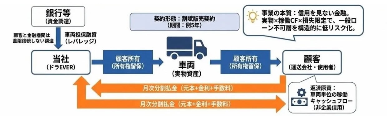 同サービスは、企業の財務状況ではなく車両単体の稼働によって生まれるキャッシュフローを基準に導入可否を判断する仕組みを採用する。銀行融資やリース審査が通らない事業者でも車両導入を可能とすることを想定しており、企業与信ではなく車両の稼働力を評価する。契約は所有権留保特約付き売買の形式を採用し、初期費用と分割払いで支払う。分割払いは契約初年度に返済比率を高めた計画とすることで元本回収を早期化する設計とした。支払い完了後は車両の所有権が利用事業者に移転する。