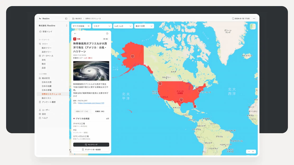 サービス・商品Resilire(レジリア、東京都港区)は12日、サプライチェーンリスク管理サービス「Resilire」でグローバルリスク検知機能を強化し、サプライチェーン影響度スコアによる評価機能を追加したと発表した。世界各地で発生するリスク情報をサプライチェーンへの影響度で評価し、重要度の高い情報を迅速に把握できるようにする。
