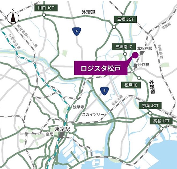 外環道の三郷南インターチェンジ(IC)まで約3.5キロ、松戸ICまで約5.1キロに位置し、東京23区や千葉、埼玉など首都圏への広域配送拠点として利用を見込む。JR常磐線北松戸駅から徒歩18分、松戸駅から徒歩19分で、通勤利便性も高い。