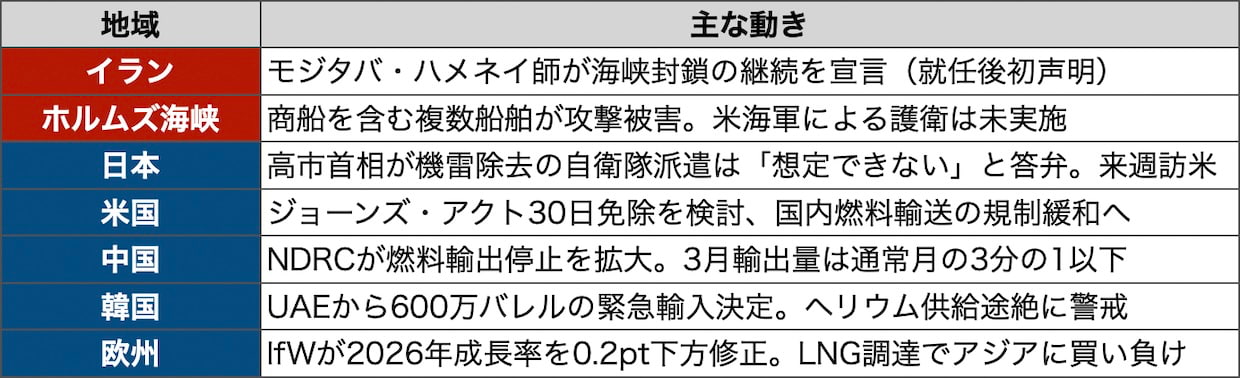 欧州ではLNGの「買い負け」が進んでいる。EU(欧州連合)は即時の石油不足はないとしているが、米国発のLNG船が欧州向けから中国向けに仕向け地を変更する事例が出始めた。供給が足りないのではなく、アジアに買い負けている段階だ。ドイツのIfW(キール世界経済研究所)は12日、商品価格の上昇を織り込んで26年の成長率見通しを0.2ポイント引き下げ、0.8%とした。