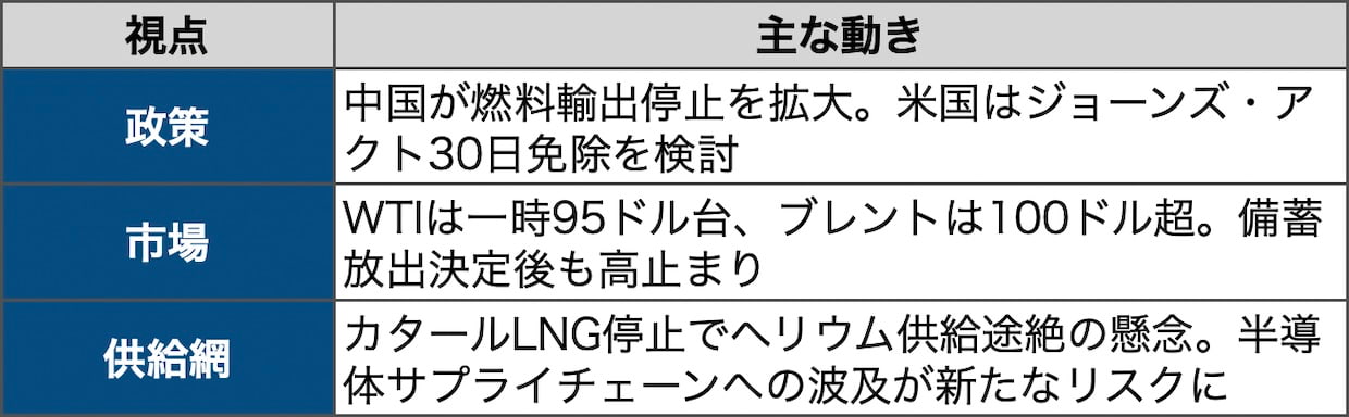 前回の見通しを更新する。短期では国際エネルギー機関(IEA)の備蓄放出が時間を稼いでいるが、各国の燃料囲い込みが放出の効果を削り始めている。中期では、前回指摘した肥料・食料への波及が進んでおり、これにヘリウムという新たなボトルネックが加わった。構造的には、問題の重心が「海峡封鎖」から「保険市場の機能不全」を経て「各国の資源囲い込み」へと移っている。