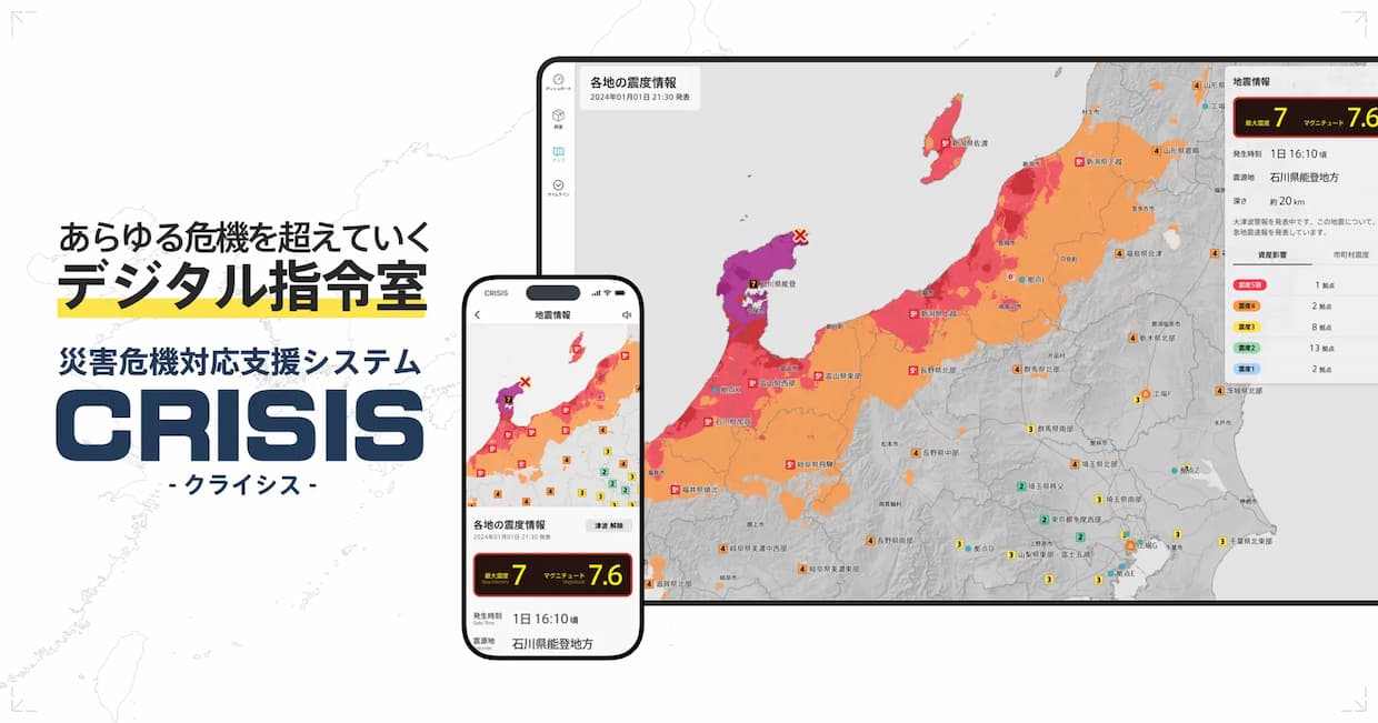 CRISISは地震・津波に加え、気象警報、河川水位、Jアラートなどの防災情報を統合し、企業の拠点や車両、サプライチェーン情報と地図上で重ねて表示する。従来は企業ごとにデータ提供事業者との契約や受信システム構築が必要だったが、同サービスではそれらを不要とし、ブラウザーから利用できるBCP基盤として提供する。