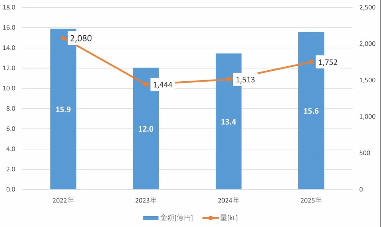 輸出単価も上昇が続き、1Lあたり890円と22年以降で最高値を記録。22年比では16.5%上昇した。主要輸出先では中国が4億3000万円(前年比3%増)で首位となり、数量も571kL(同12%増)と伸長。米国は4億1000万円(35%増)で2位、数量は395kL(19%増)だった。韓国も2億3000万円(33%増)、316kL(38%増)と大きく伸び、上位市場の需要拡大が全体を押し上げた。