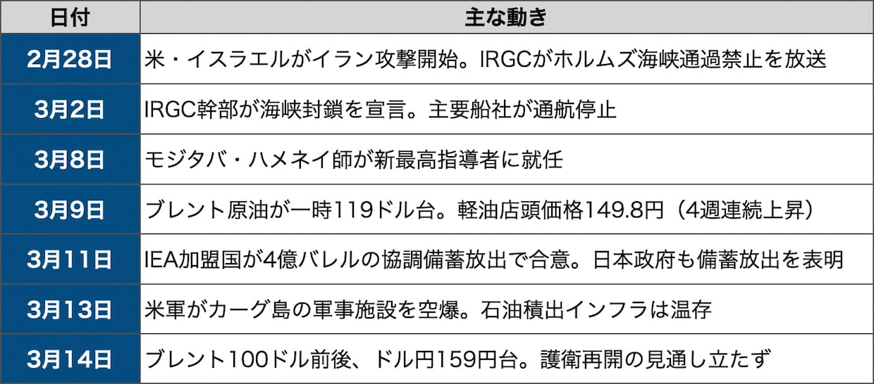 ブレント原油は13日の取引で100ドル前後で推移した。9日には一時119ドル台まで急騰した。EIA(米エネルギー情報局)は今後2か月間95ドル超を予測するが、この見通しは海峡の早期再開が前提だ。封鎖が長期化すれば、ゴールドマン・サックスが想定する110ドル、オックスフォード・エコノミクスが「世界経済の限界点」とする140ドルに向かうリスクがある。