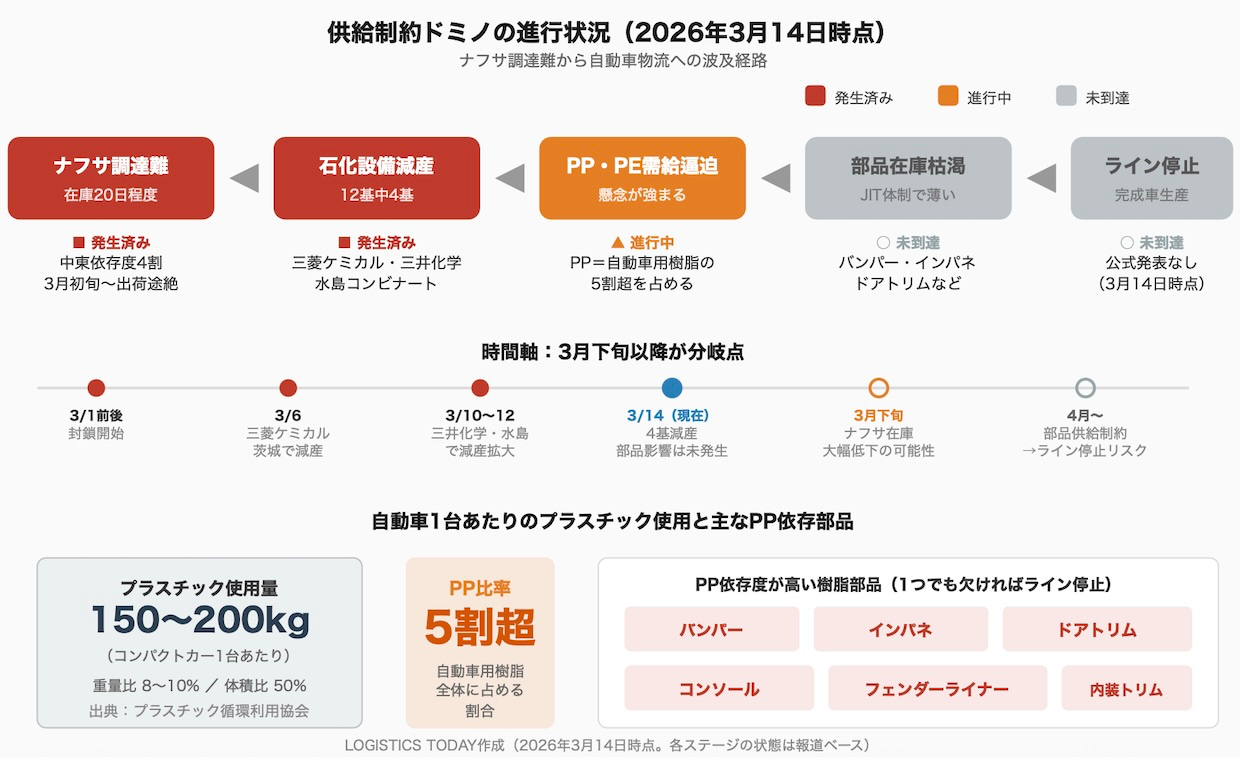 整理すると、「ナフサ在庫枯渇→石化減産→PP・PE需給ひっ迫→部品在庫枯渇→ライン停止」というドミノがどこまで進んだかが見えてくる。14日時点では「石化減産」まで進み、「PP・PE需給の引き締まり」が意識され始めている。「部品在庫枯渇」には至っていない。ナフサ在庫が大きく低下する3月下旬以降、次のコマが倒れるかどうかが焦点になる。