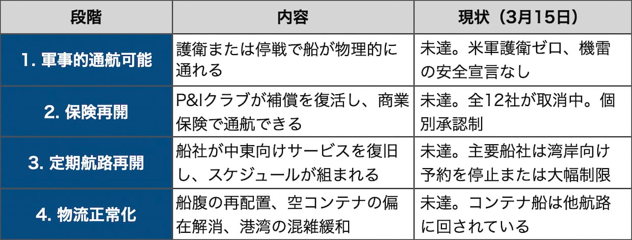 海峡が開いても、物流はすぐには戻らない。通航再開から物流正常化までには4つの段階がある。