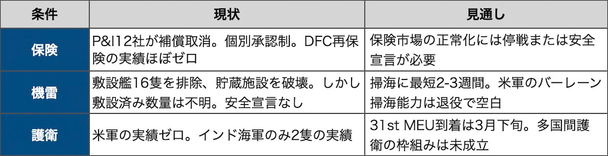 ホルムズ海峡の商業通航が再開するには、少なくとも3つの条件がそろう必要がある。15日時点で、いずれも満たされていない。