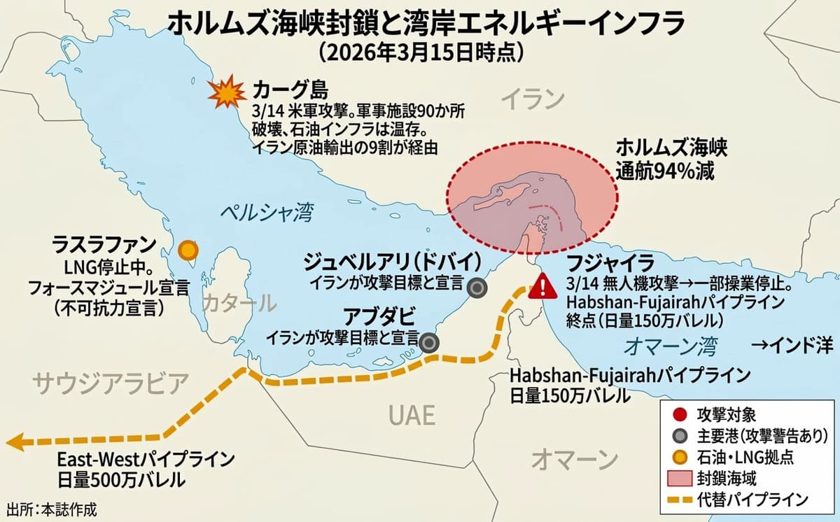 ▲ホルムズ海峡封鎖と湾岸エネルギーインフラ(3月15日時点、クリックで拡大)
